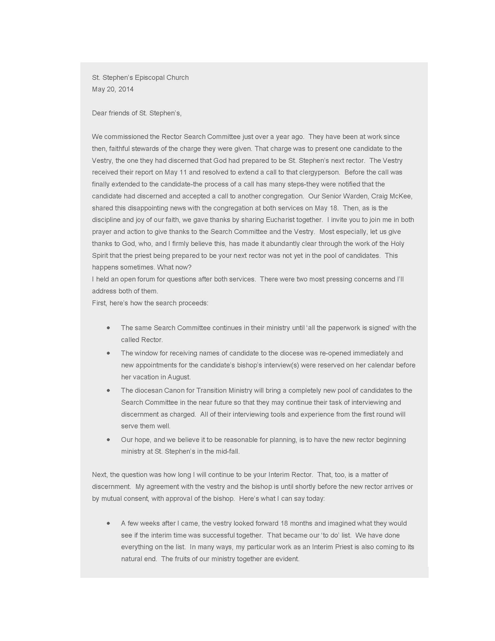 We thought we were there, but we're not there yet. On May 11, our search committee presented a candidate to the vestry, who resolved to extend a call to this chosen candidate. Before that call could be extended, however, the committee and the vestry were notified that the candidate had accepted a …